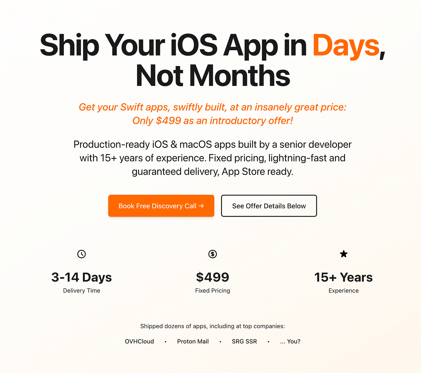 Benefiting from my experience and knowledge not only in technical areas, but also in the app market, ASO, Apple's Human Interface Guidelines, and the latest and greatest from Swift and the Apple Development world.